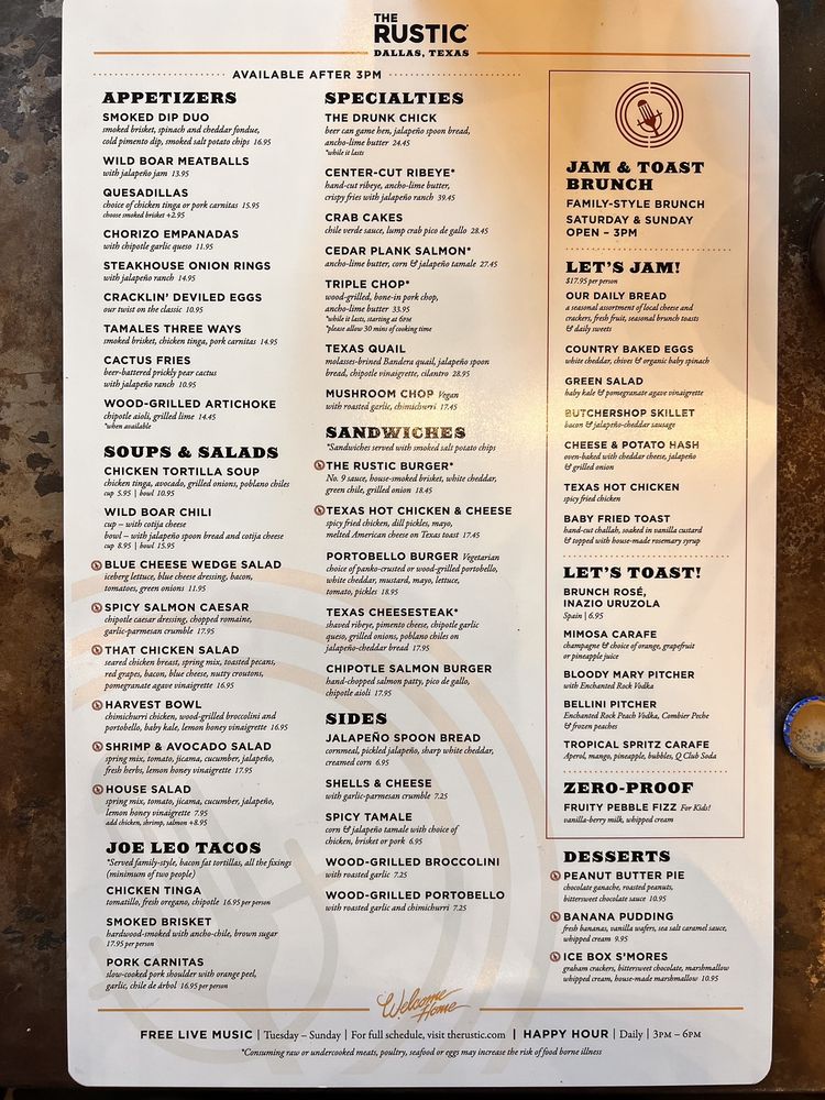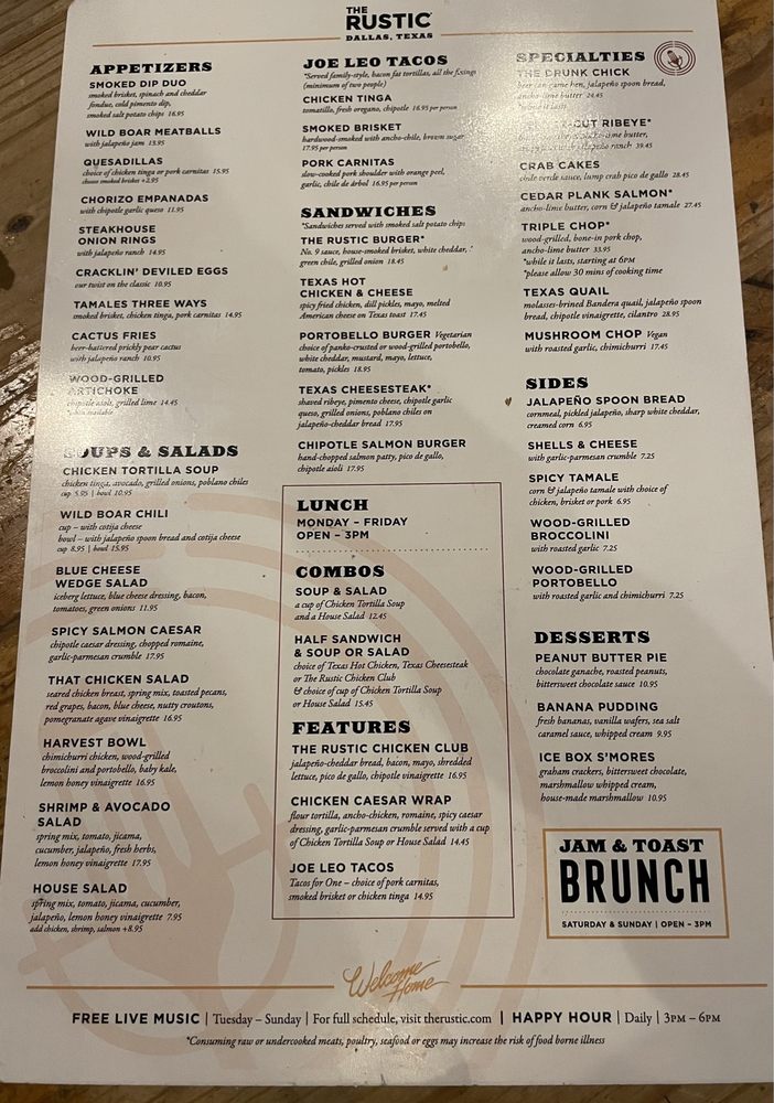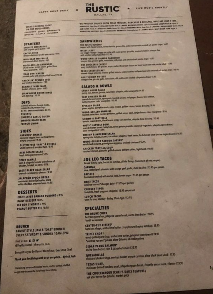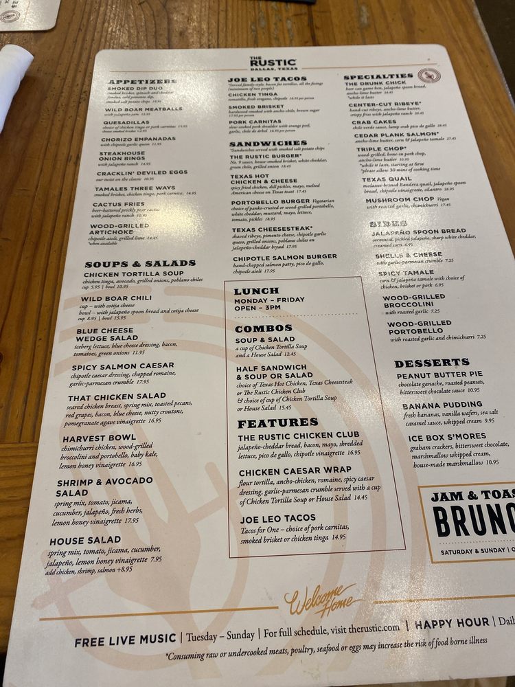 Introducing The Rustic, a vibrant music venue, bar, and New American restaurant in Dallas, TX. Known for its welcoming atmosphere, live music, and diverse menu options, The Rustic is a must-visit spot for food and entertainment enthusiasts. With a range of appetizers like smoked brisket dip duo and wild boar meatballs, guests can indulge in flavorful bites that cater to various tastes. The Joe Leo Tacos, featuring chicken tinga, smoked brisket, and pork carnitas, are a must-try for taco lovers. The restaurant's dedication to providing a unique dining experience is evident in their attention to detail, from their extensive drink selection to their outdoor seating options. Whether you're looking to enjoy a casual meal or dance the night away, The Rustic offers something for everyone. Don't miss out on the chance to savor delicious dishes and create lasting memories at this popular Dallas hotspot.